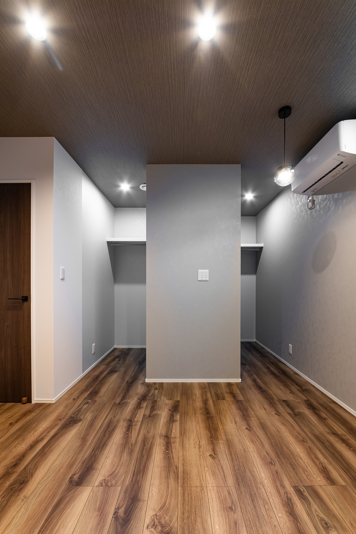 主寝室に設けられた夫婦それぞれのウォークインクローゼットは、空間をゆるやかに仕切りながらも、個別の収納スペースを確保したこだわりの設計。