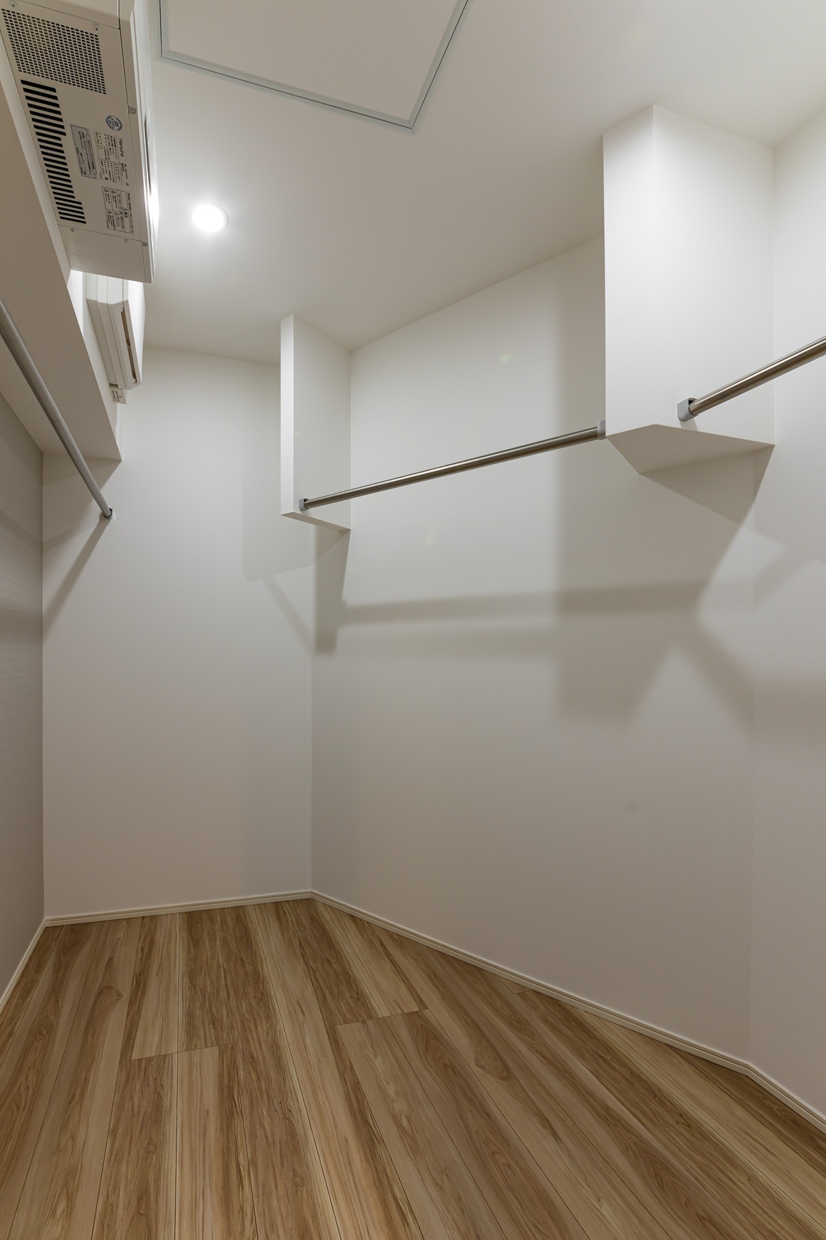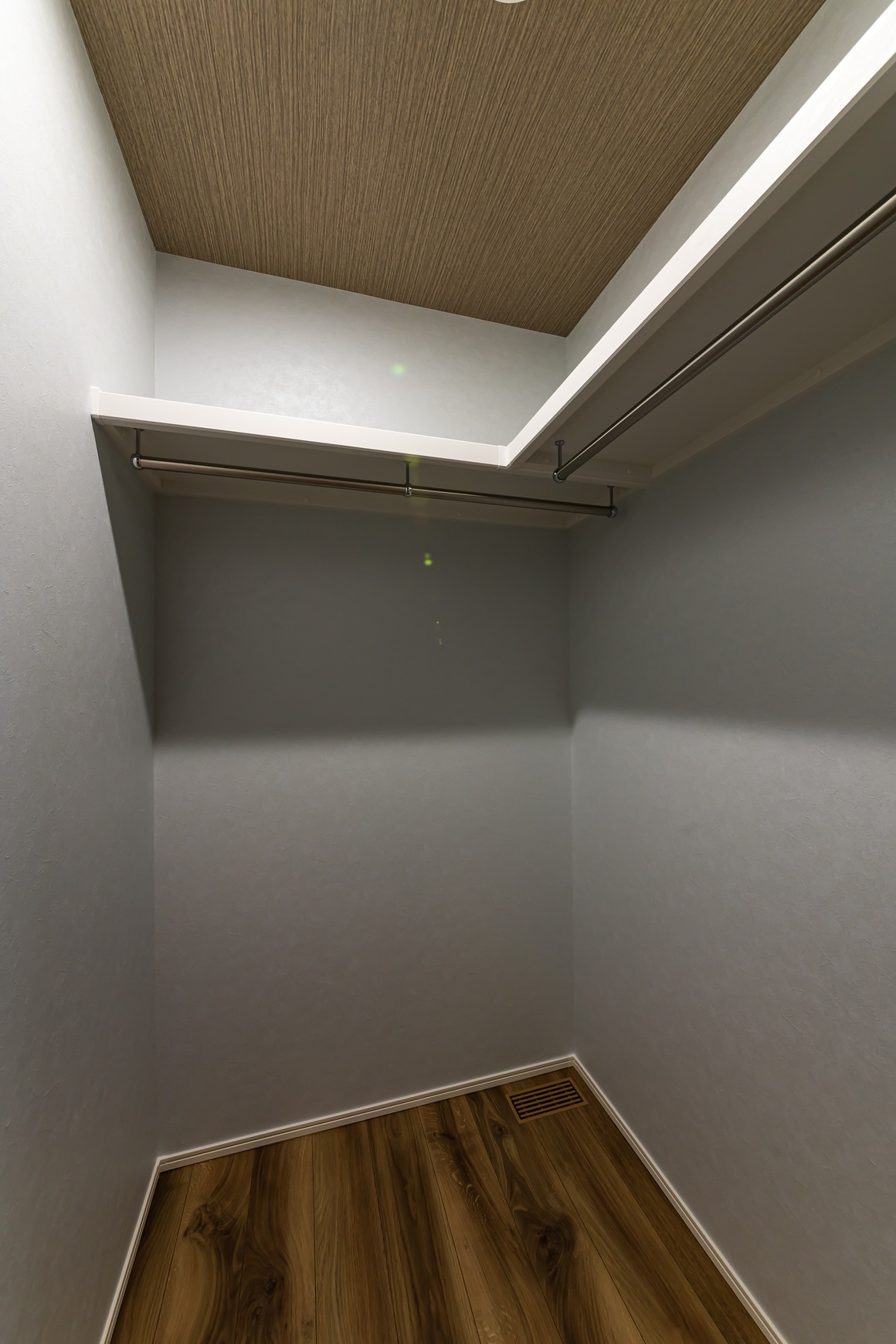 クローゼットにはあえて扉を設けず、開放的かつ使い勝手の良い設計に。空間を広く見せると同時に、衣類の出し入れもスムーズです。