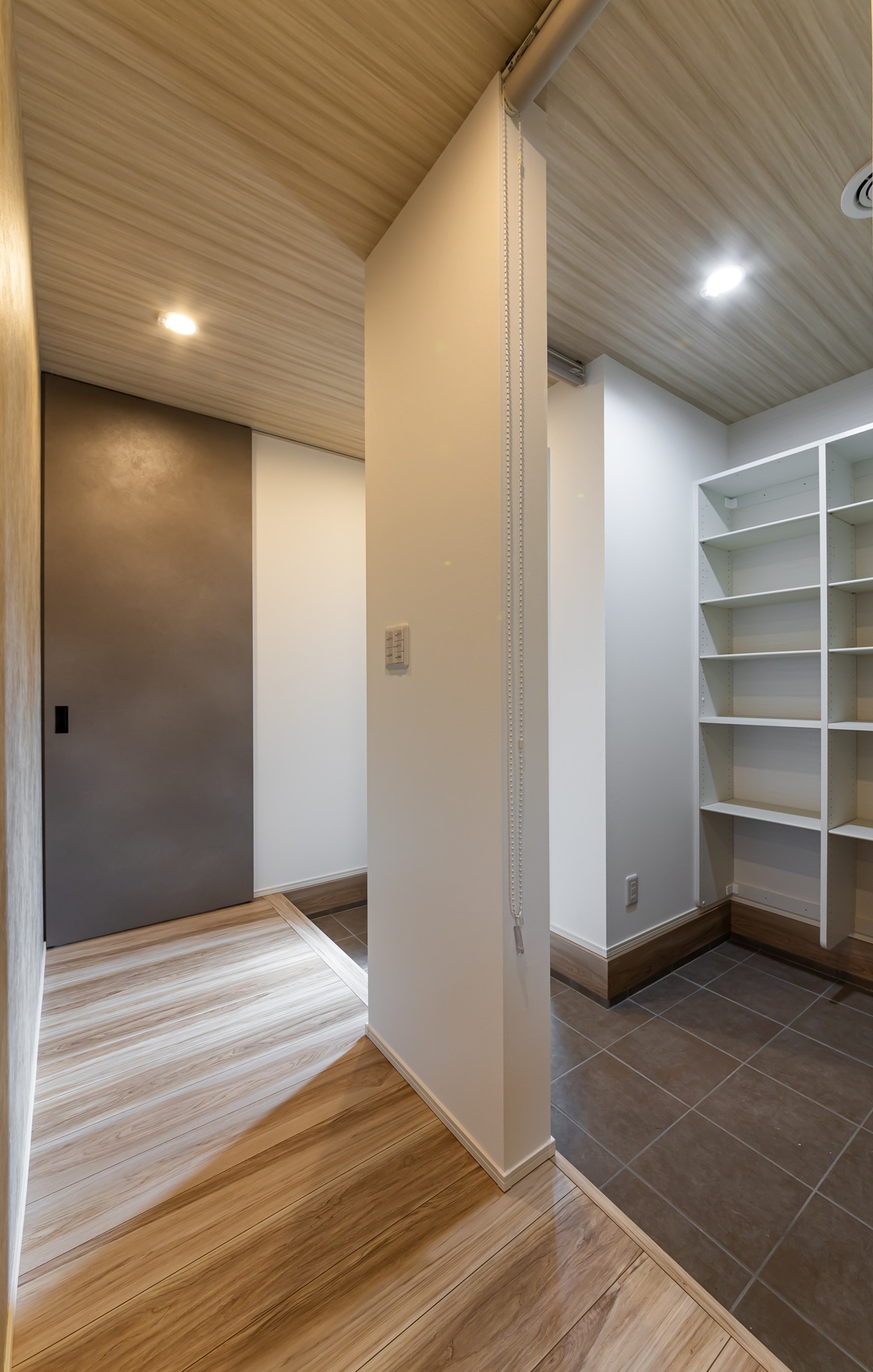 ロールスクリーンで生活感を上手に隠しつつ、使い勝手も妥協しない。そんなこだわりが詰まった、機能美あふれる玄関空間です。