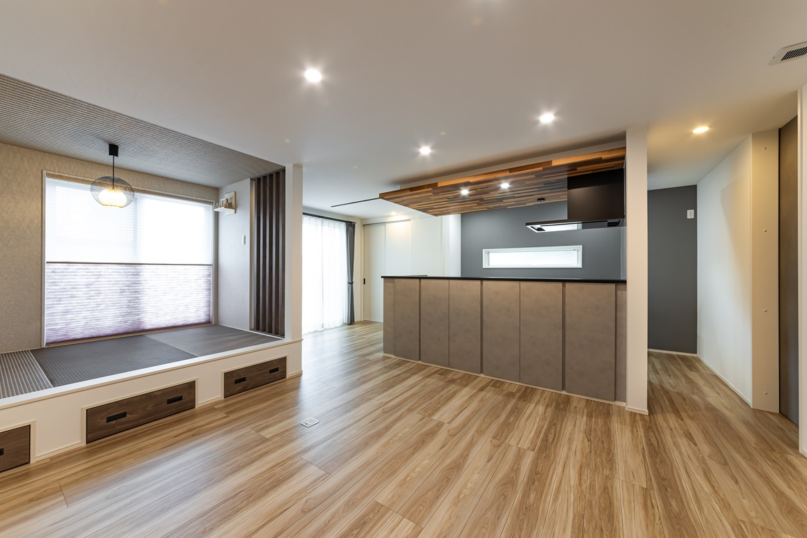 リビングと一体化するように設けられた小上がりの和室は、家族がくつろいだり、お子様のお昼寝や来客用にも便利な多目的スペースです。畳の下には引き出し収納も備え、空間を無駄なく活用できます。