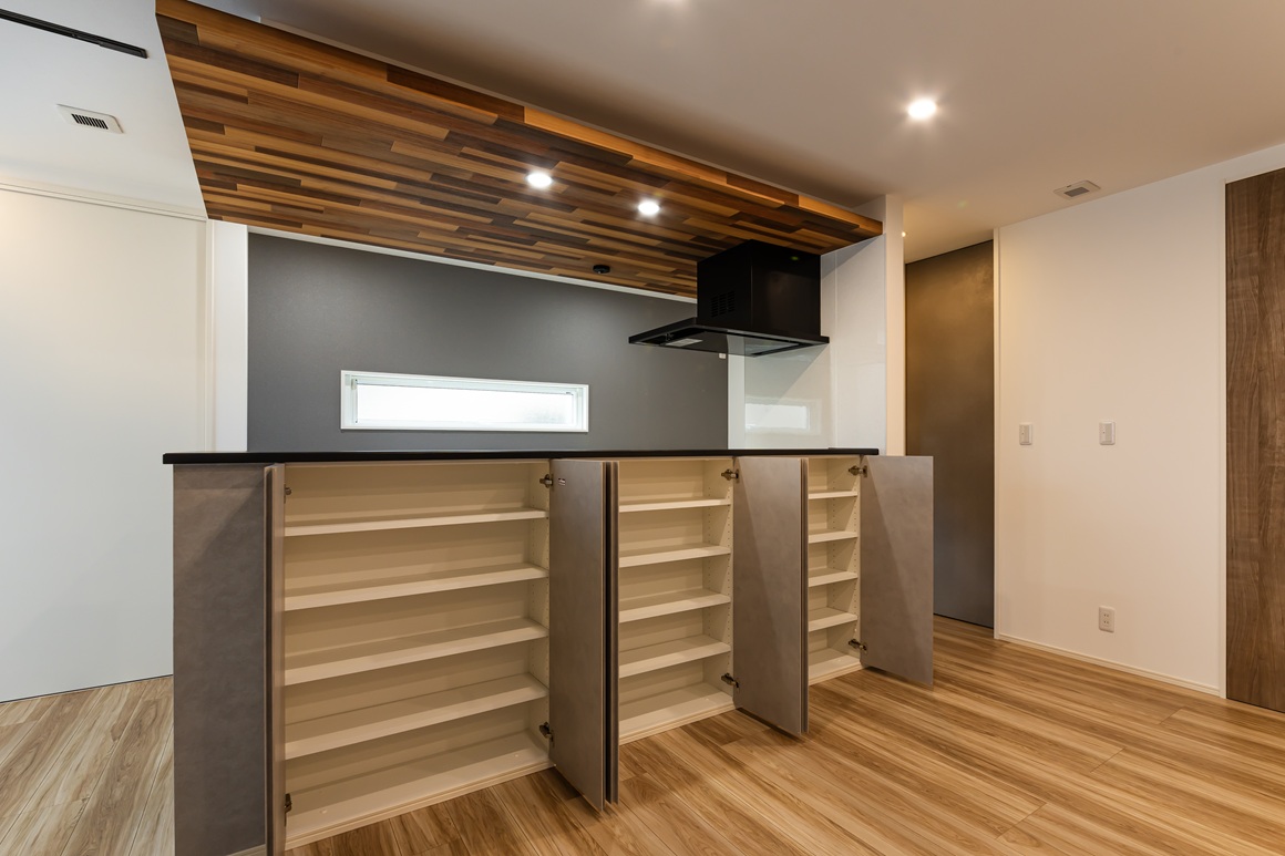 背面にはカウンター収納を備え、使い勝手と収納力も抜群。グレートーンの壁と調和するスタイリッシュなインテリアが、落ち着きと上質感を演出しています。
