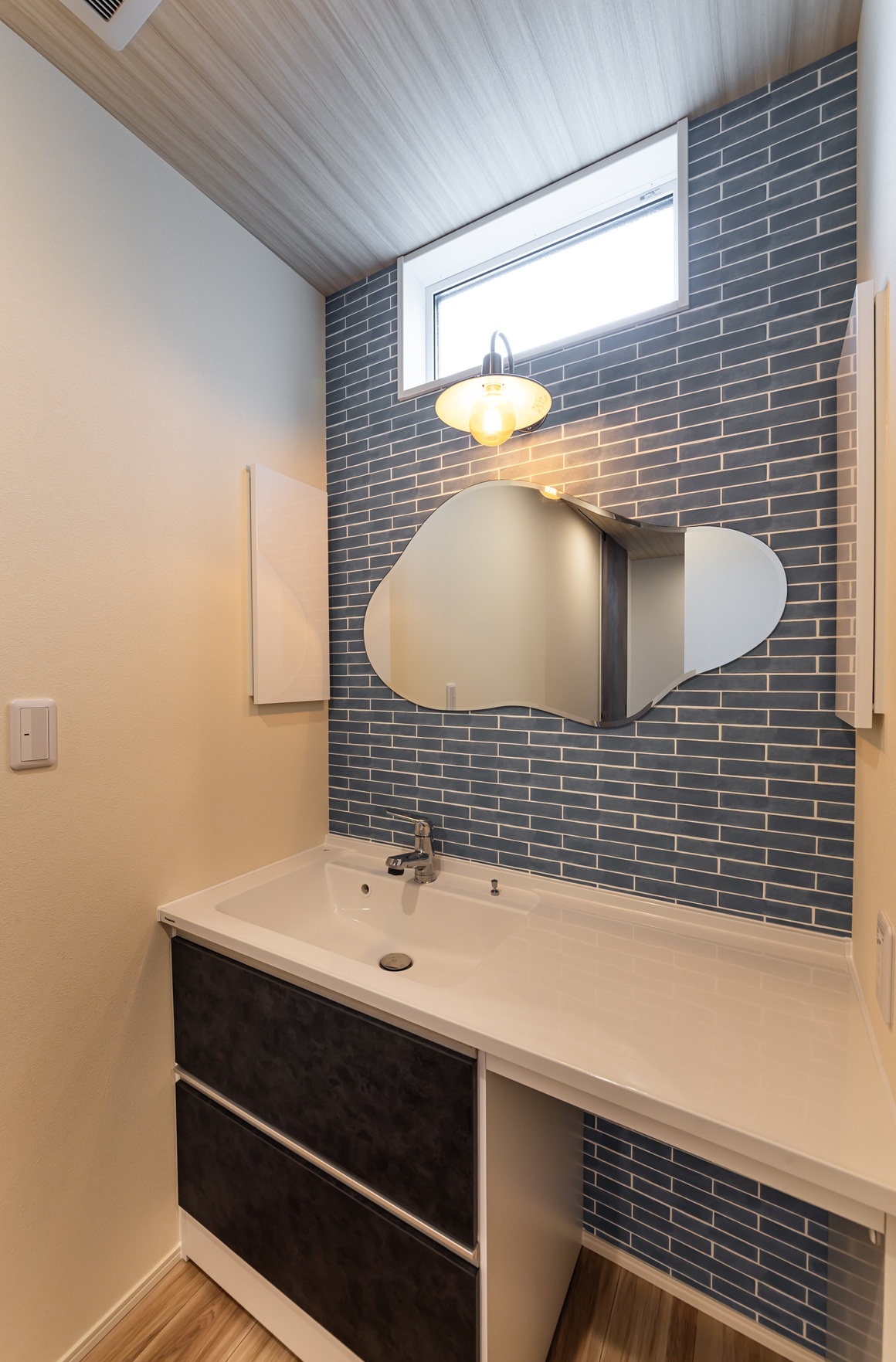 採用されたのは、スタイリッシュで機能的なパナソニックの「シーライン」洗面台。収納力と清掃性を兼ね備えた、毎日使いやすい仕様です。そして目を引くのが、お施主様こだわりの雲のようなフォルムのミラー。あたたかみのある照明と相まって、空間にやさしさと遊び心を添えています。