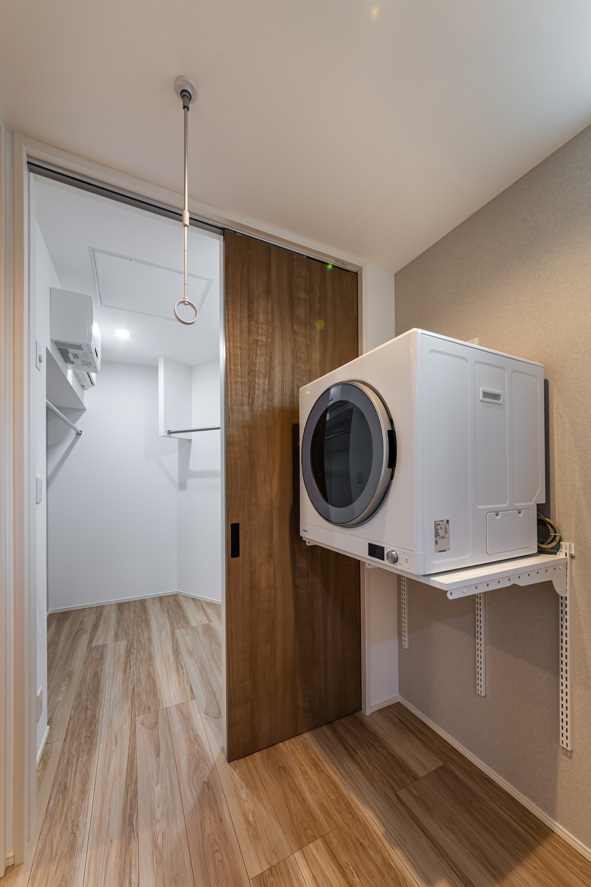 家事ラクを叶える、機能性と動線にこだわった脱衣室まわりの空間設計。脱衣室には、ガスの力でスピーディに乾かす衣類乾燥機「乾太くん」を設置。洗濯物は約1時間でふっくら仕上がり、天気や時間に左右されない快適な家事が実現します。そのすぐ奥にはファミリークロークを配置し、乾いた洗濯物をそのまま収納できる理想的な動線に。家族の衣類をまとめて管理でき、毎日の片付けもスムーズです。さらに、手前の壁には折りたたみ式の家事カウンターを設置。アイロンがけや畳む作業に便利で、使わないときは壁に収納できるため、空間を無駄なく活用できます。