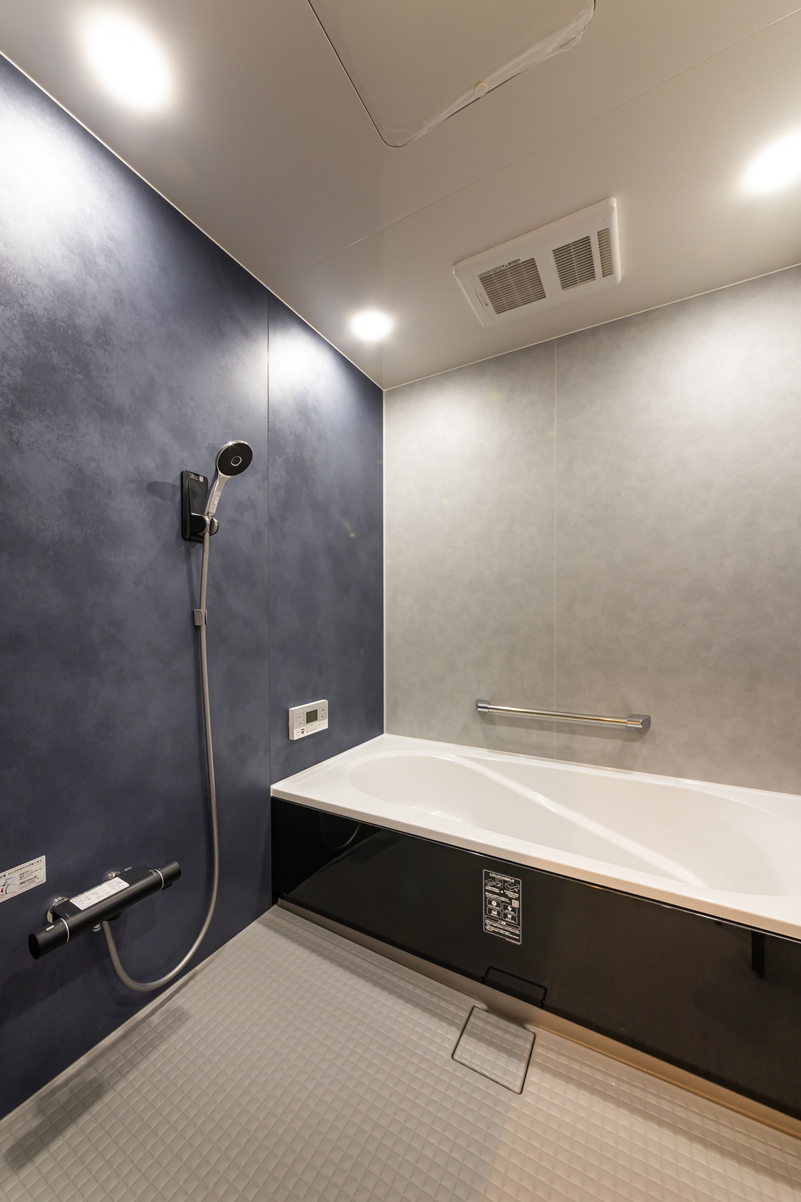浴室の壁面には、アクセントとして深みのあるステインブルー、メインにはやさしいシルバーグレーのパネルを採用し、上質なリラックスタイムを演出します。