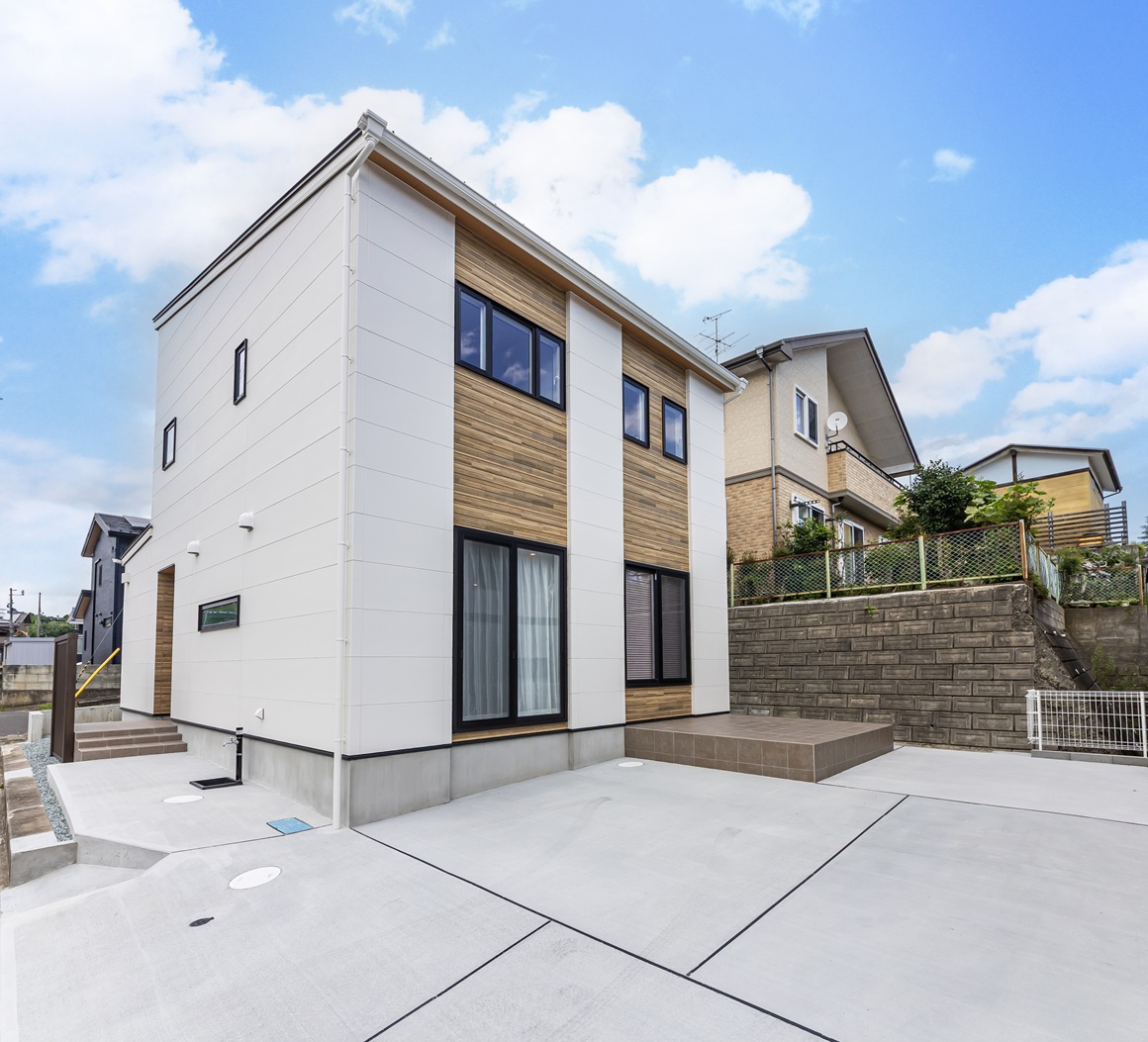 白を基調とした外壁に、木目のアクセントが柔らかな温かみを添え、落ち着きのある佇まいを演出しています。玄関側はスリットフェンスと軒天の木目調仕上げが上品な印象を与え、外からの視線をやわらげながら、程よい開放感を確保。