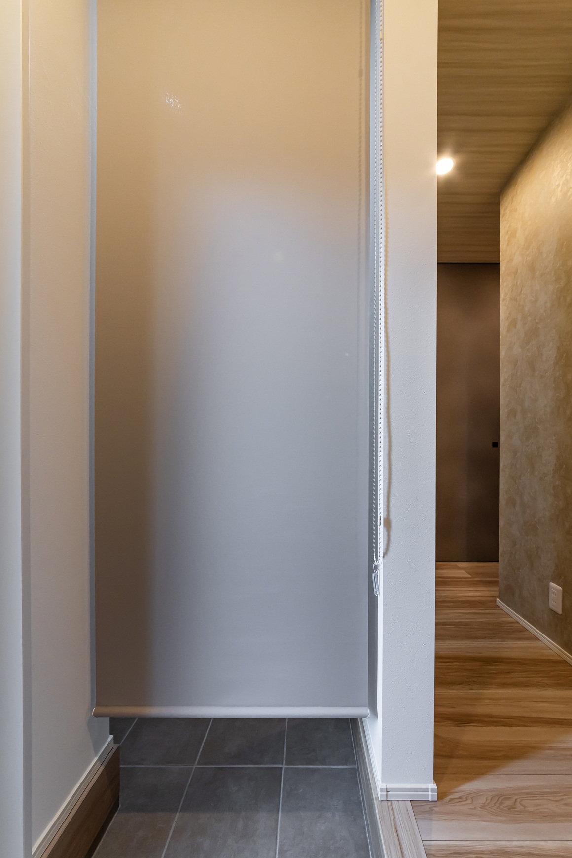 ロールスクリーンで生活感を上手に隠しつつ、使い勝手も妥協しない。そんなこだわりが詰まった、機能美あふれる玄関空間です。