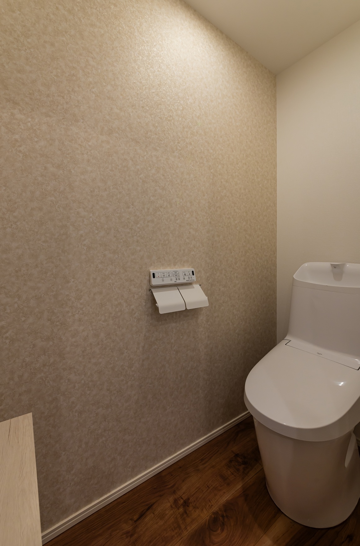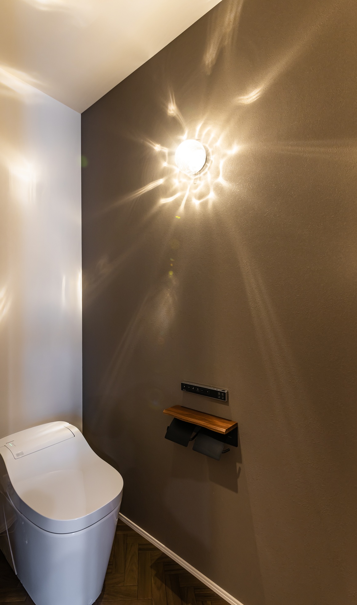採用されたのは、スタイリッシュで機能的なパナソニックの「シーライン」洗面台。収納力と清掃性を兼ね備えた、毎日使いやすい仕様です。そして目を引くのが、お施主様こだわりの雲のようなフォルムのミラー。あたたかみのある照明と相まって、空間にやさしさと遊び心を添えています。