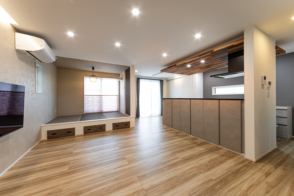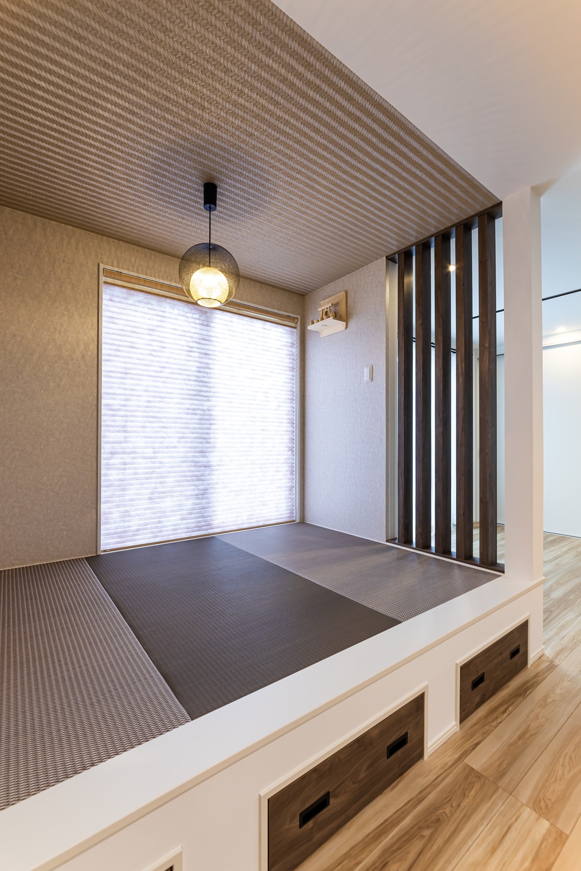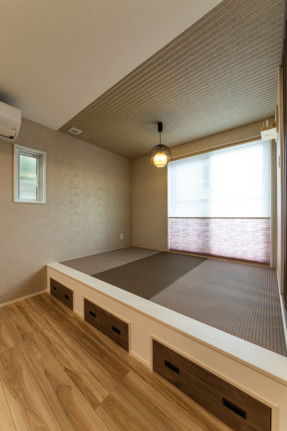 リビングと一体化するように設けられた小上がりの和室は、家族がくつろいだり、お子様のお昼寝や来客用にも便利な多目的スペースです。畳の下には引き出し収納も備え、空間を無駄なく活用できます。