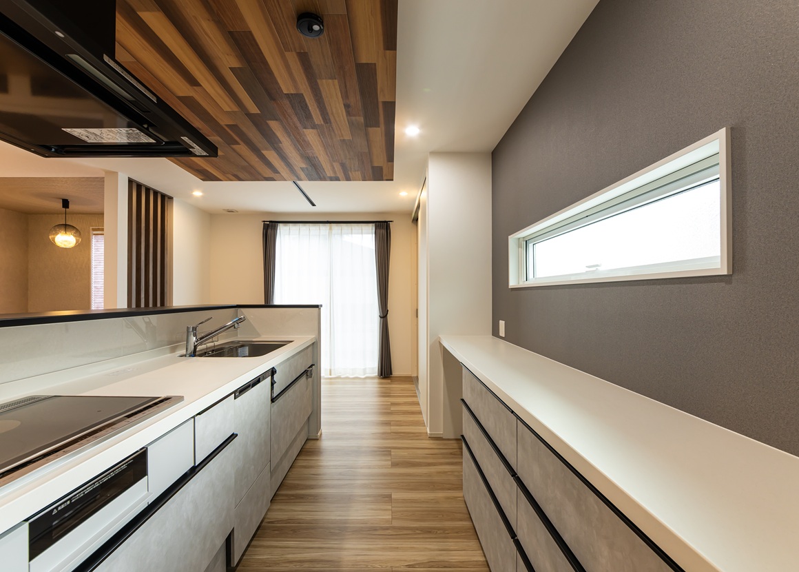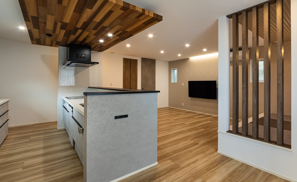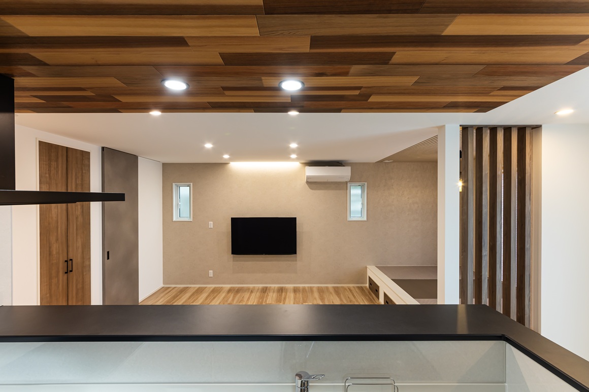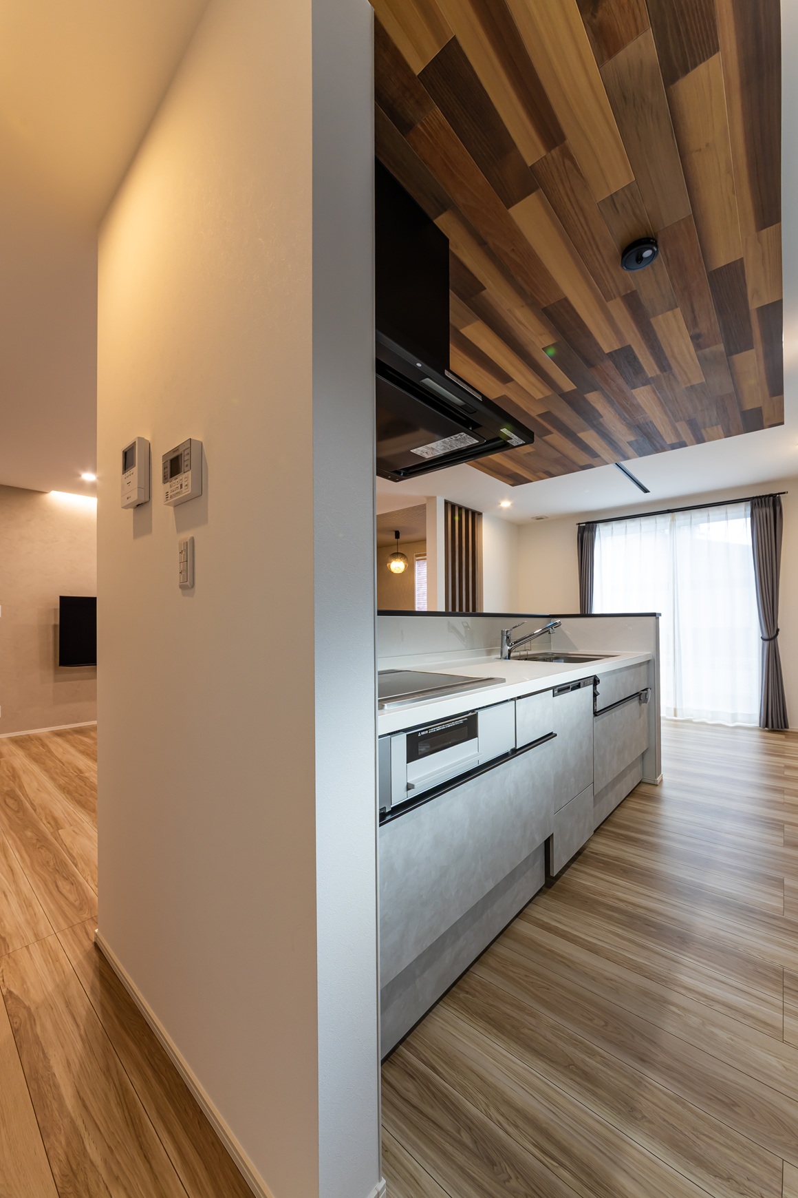 キッチン上部の木目調の折り下げ天井が空間にリズムとアクセントを加え、デザイン性を高めながら、空間をゆるやかにゾーニング。
